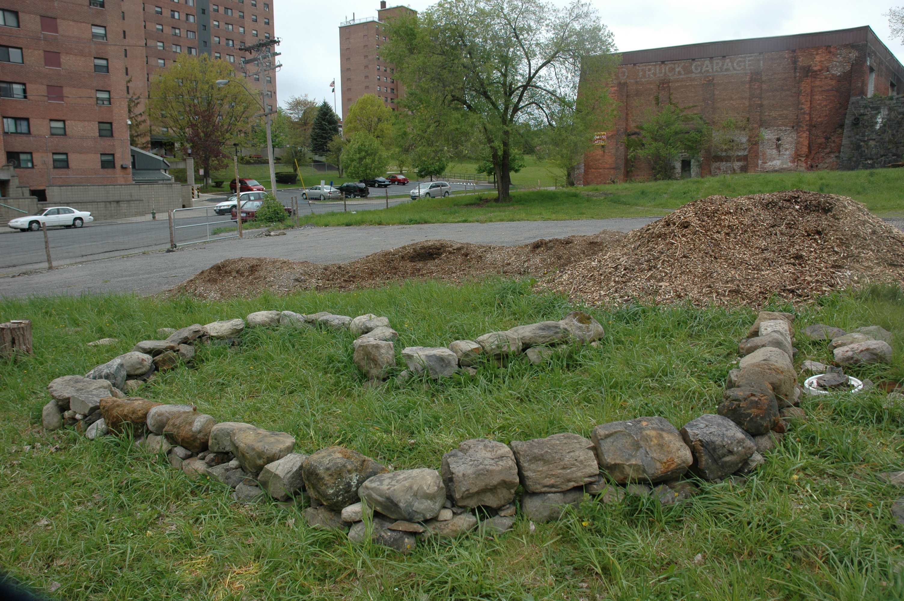 This bed was made with rocks that were pulled out of the fields and thrown into a wall pile on an old farm north of Albany. It was built without mortar, which took a really long time! It has been planted with strawberries and greens.