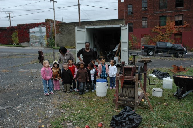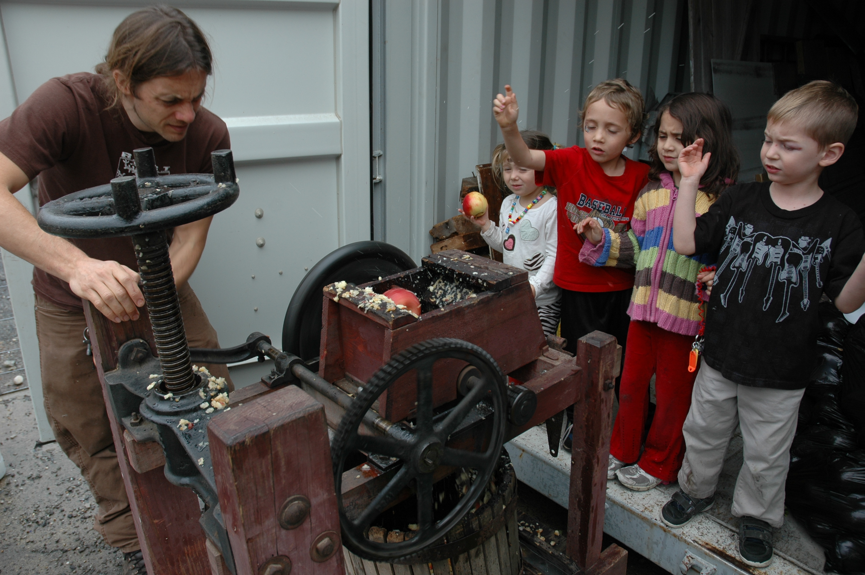 This week we gleaned apples at Samascott Orchard with the upstairs kids from the Albany Free School. We made cider with some of the apples at the Radix Center with our antique cider press.