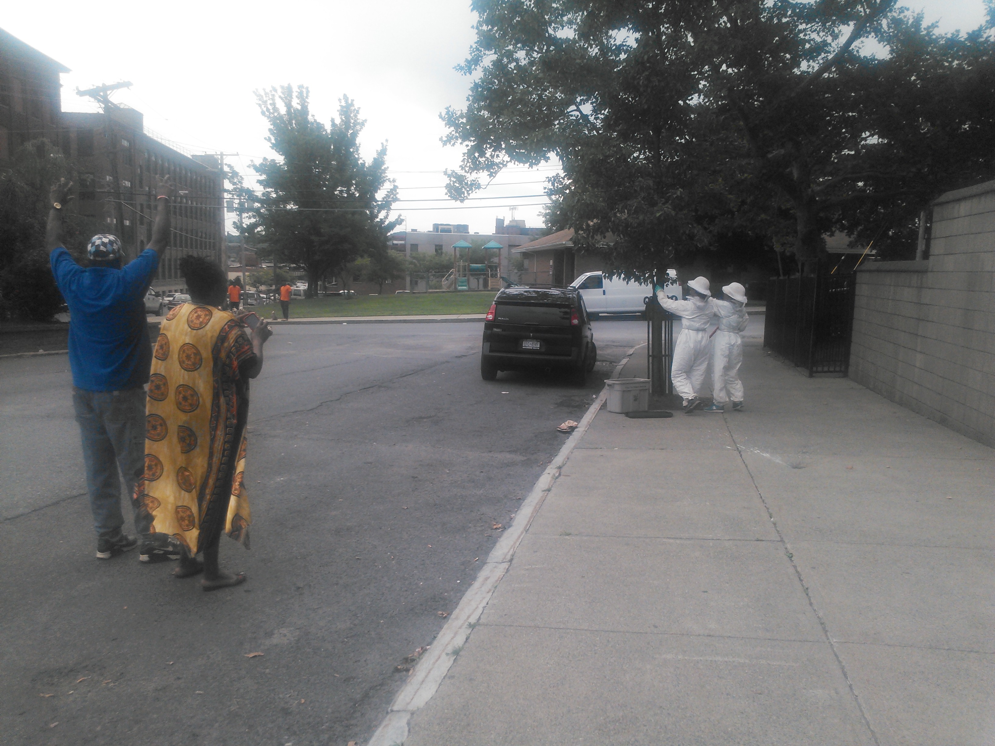 One day, when we arrived at Radix, neighbors alerted us that there was a beehive in a tree next to the adjacent Lincoln Tower that was about to be destroyed.