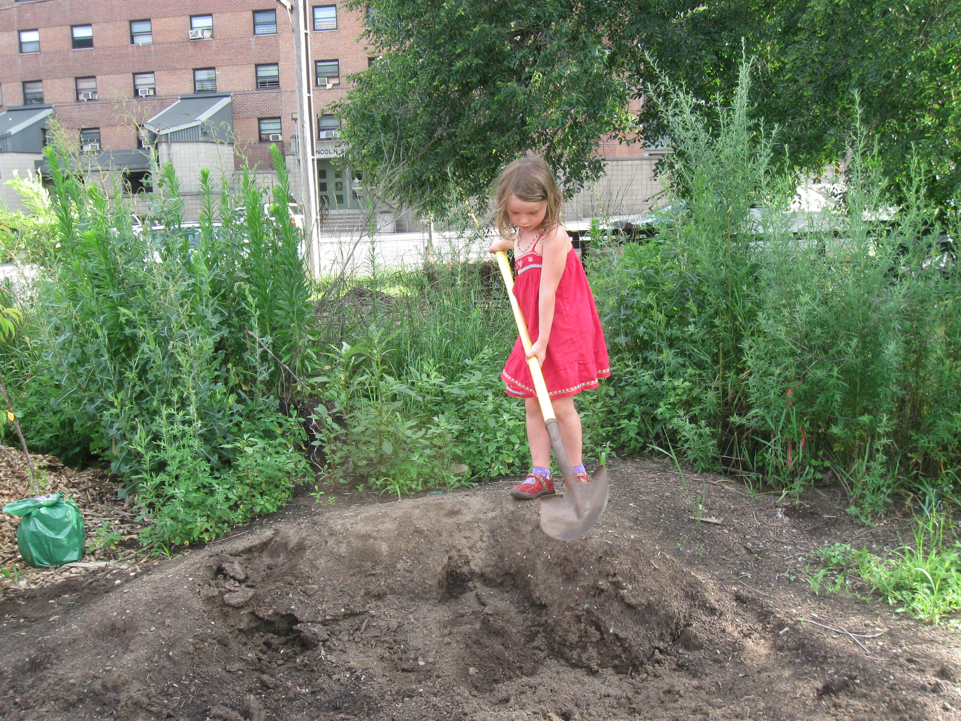 Elly doing a great job shoveling dirt into the wheelbarrow.