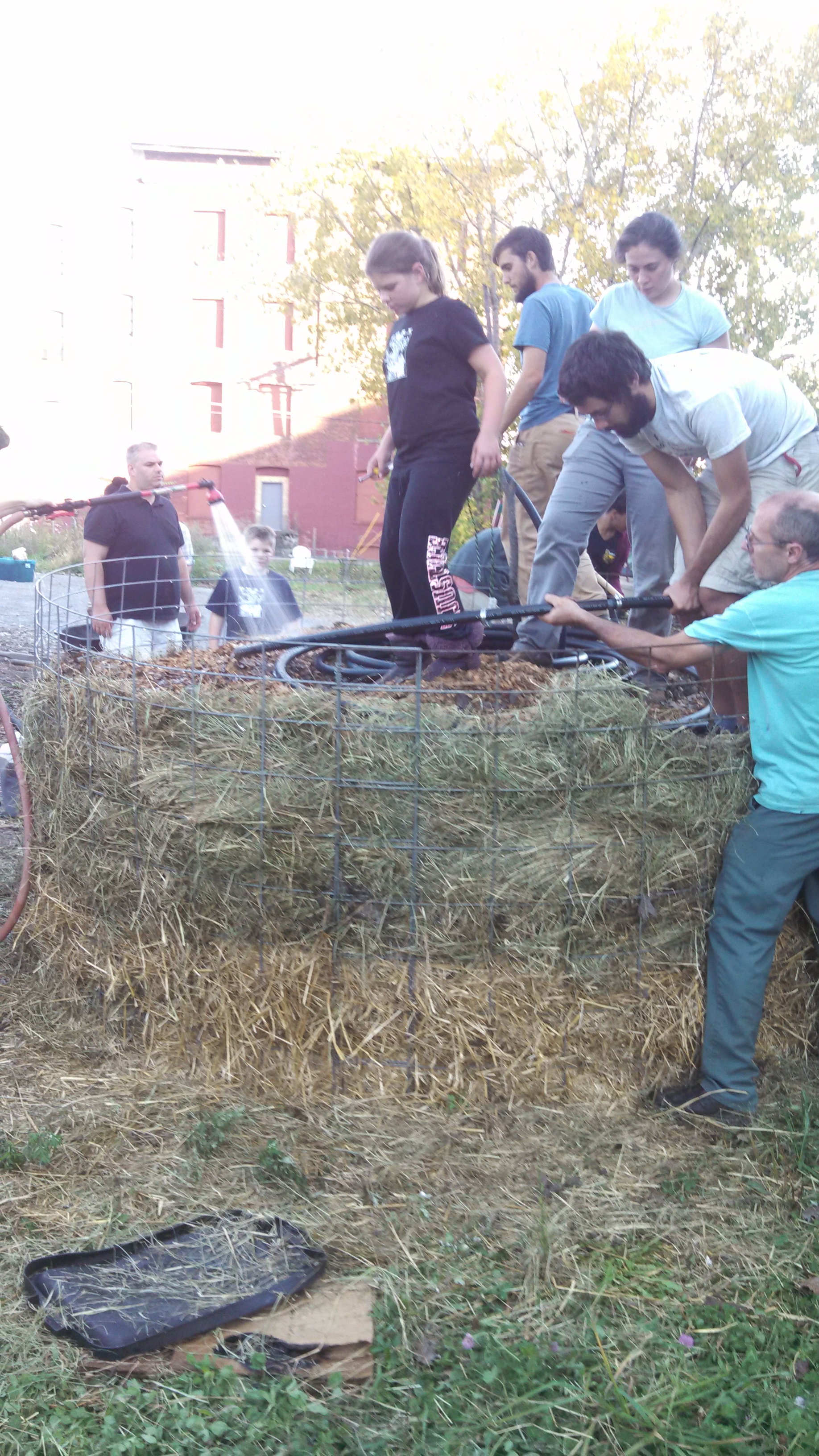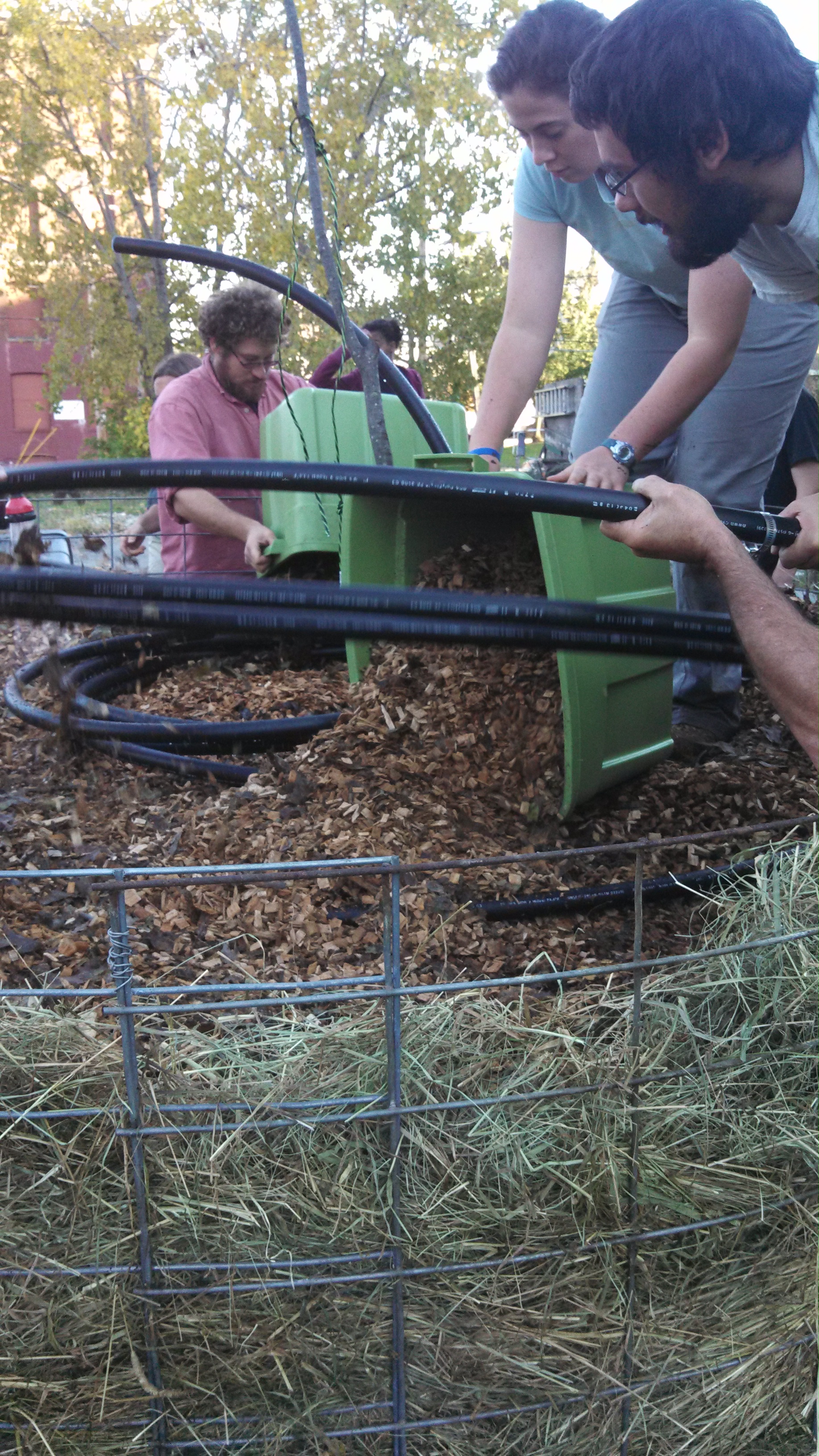 The biothermal compost heater is an attempt to utilize wood chips, an urban waste product, to produce heat for warming our greenhouse this winter. It was built at this October’s RUST class, and took 20 people approximately three hours to complete.