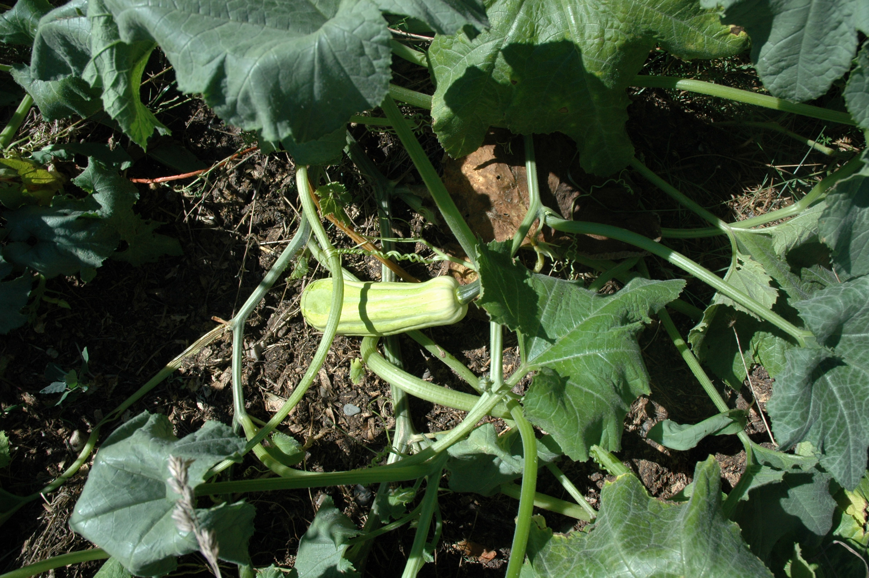 Some unexpected volunteers sprouted out of the rabbit manure pile and the compost piles! It has been hot and dry, so the leaves are looking parched. (Hoping for rain!) But the fruits are growing!